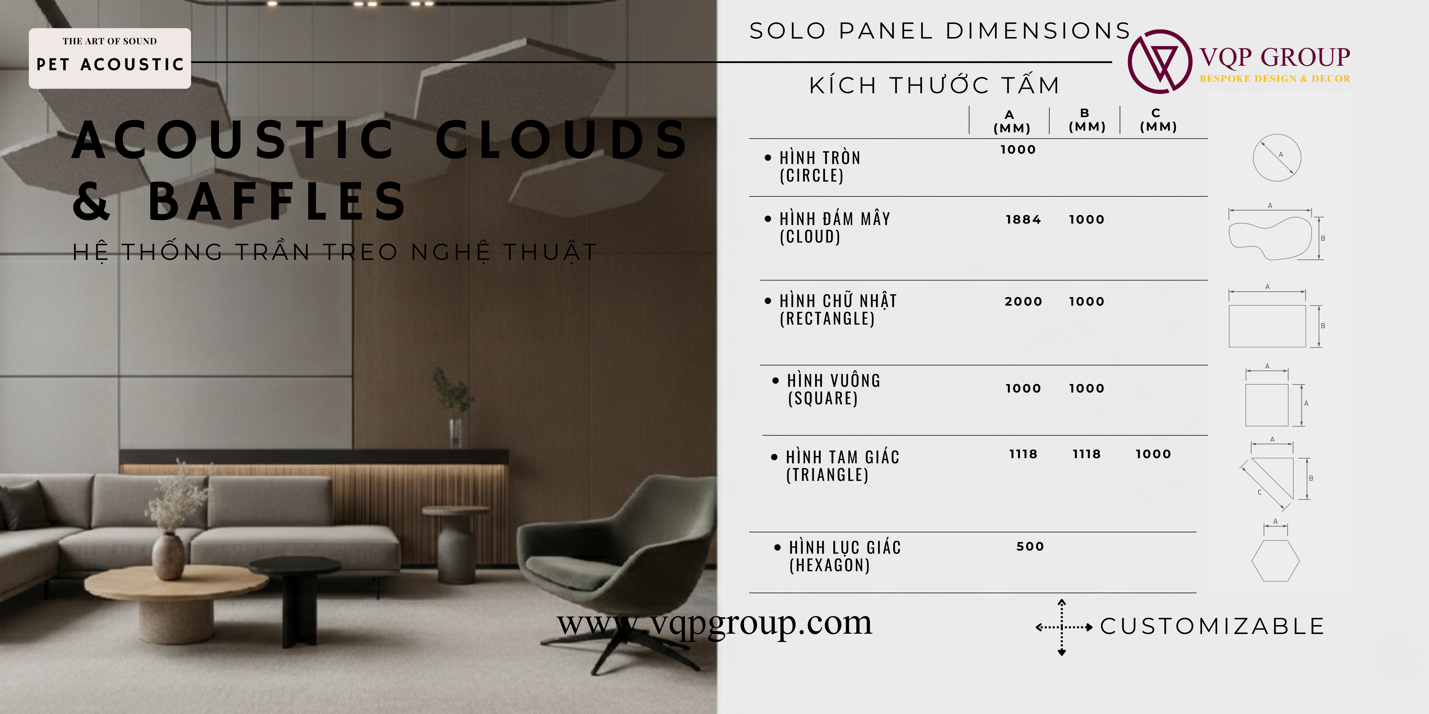 Khác với các loại trần thạch cao hay tấm ốp tường chỉ hút âm một mặt, hệ thống trần treo của VQP Group là các tấm Free-hanging elements (treo tự do).