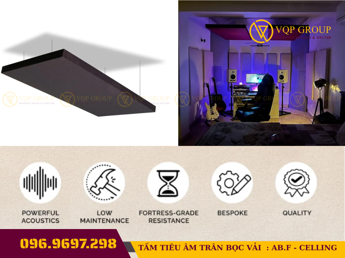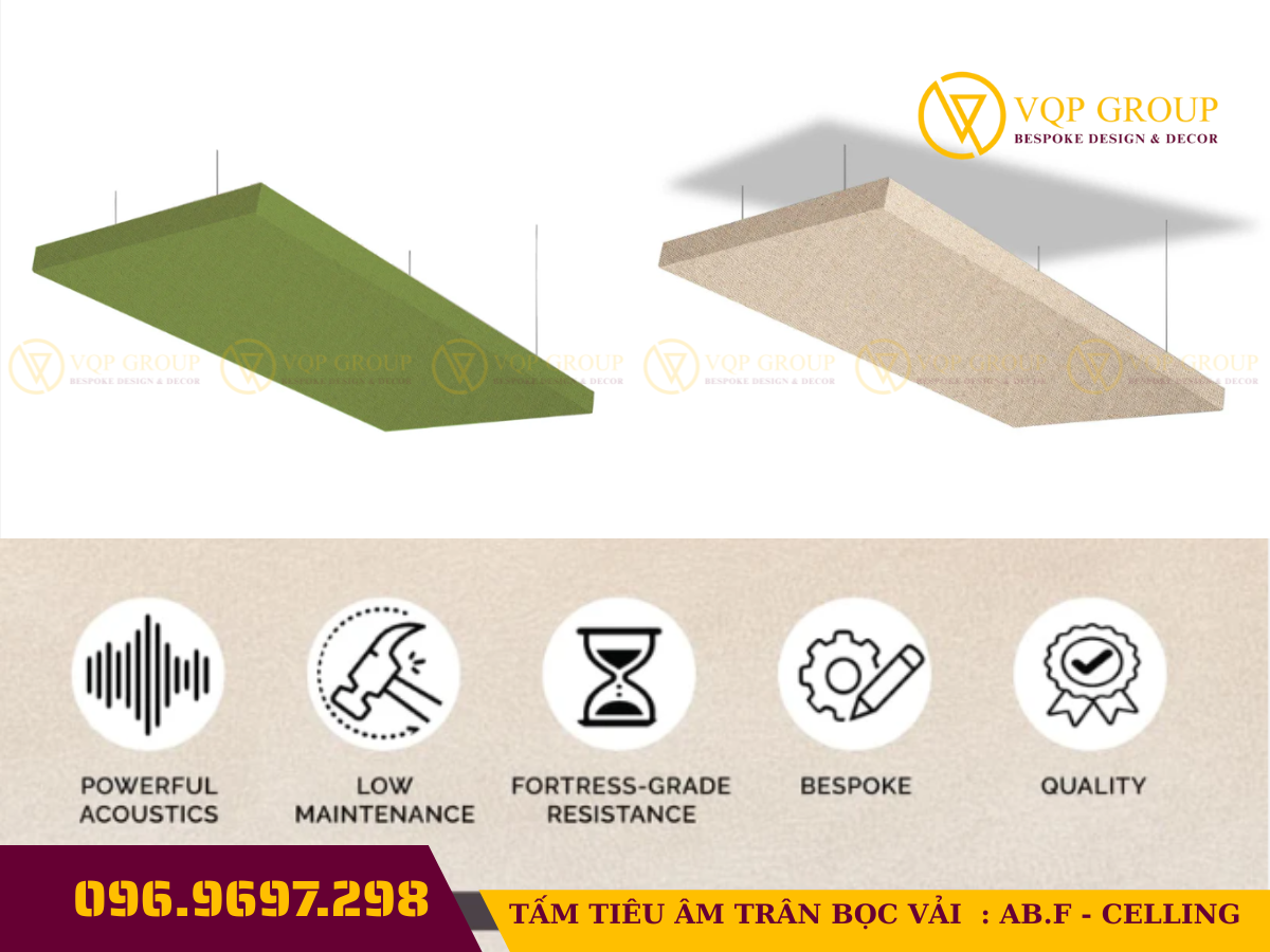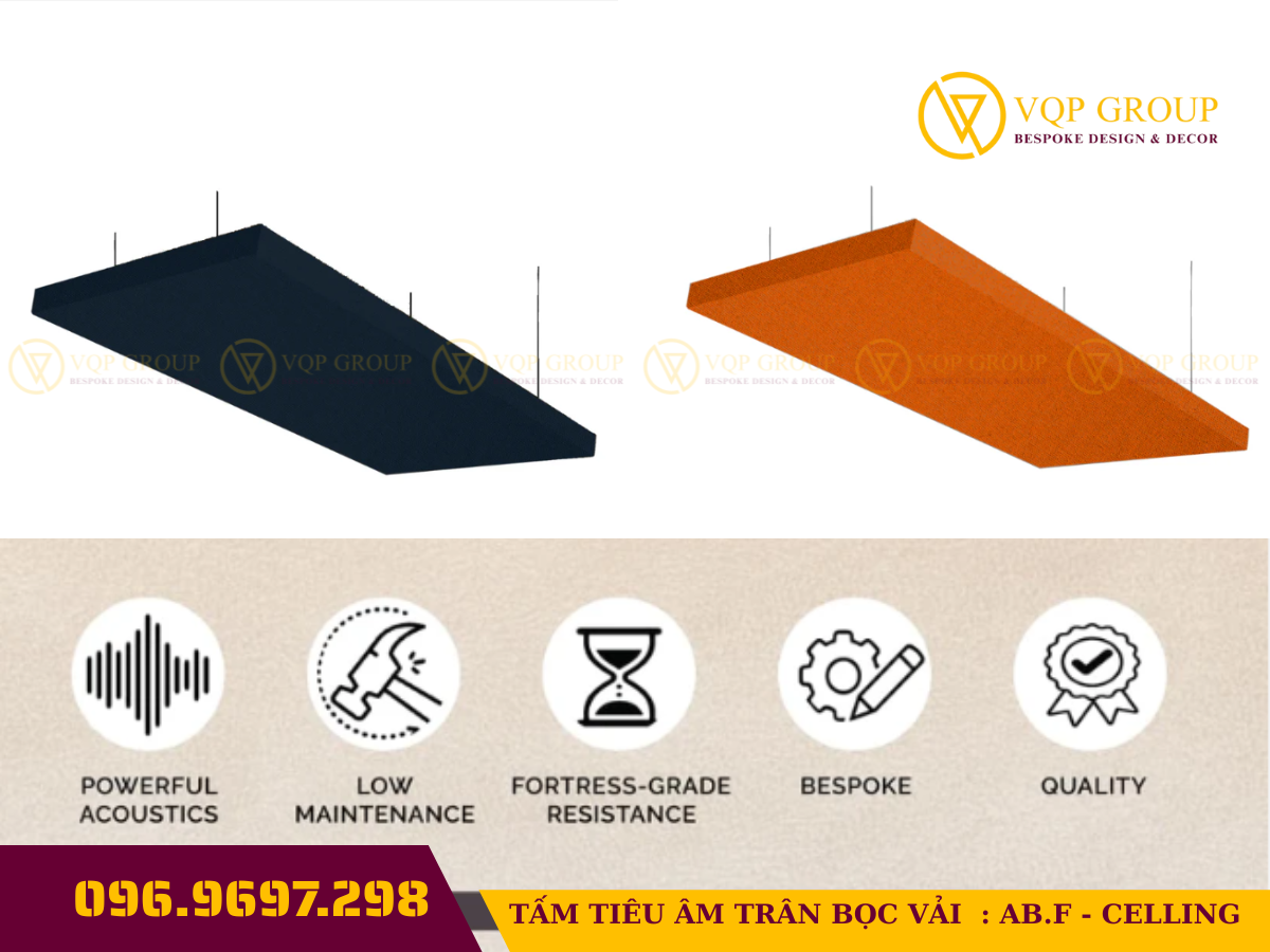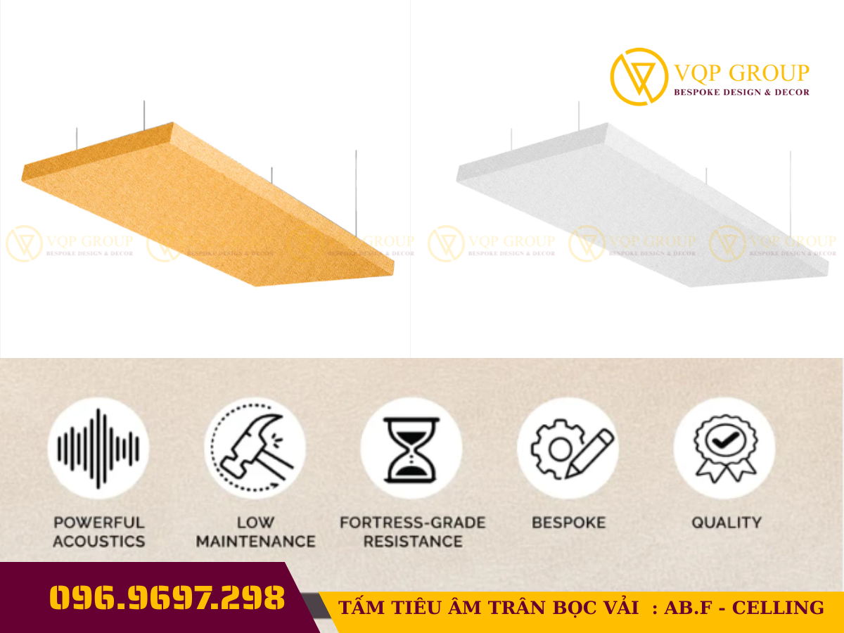 Đặc điểm Thông số chi tiết Tên sản phẩm Tấm tiêu âm bọc vải (Absorber) - Mã: AB.F-CELLING Cấu tạo Khung chịu lực, lõi bông tiêu âm, bọc vải nỉ cao cấp bên ngoài Kích thước 600x600mm hoặc 600x1200mm (Có thể tùy chỉnh theo yêu cầu) Độ dày 50mm - 100mm (Tùy chọn theo mức độ xử lý âm học) Màu sắc Cam, Nâu, Xám, Đen... (Bảng màu đa dạng theo decor studio) Tính năng Triệt tiêu tiếng vang (Echo), chống rung, kháng cháy lan Ứng dụng Studio chuyên nghiệp, Home Office, Phòng giải trí Hi-end ✅ Tại sao bạn cần AB.F-CELLING ?
